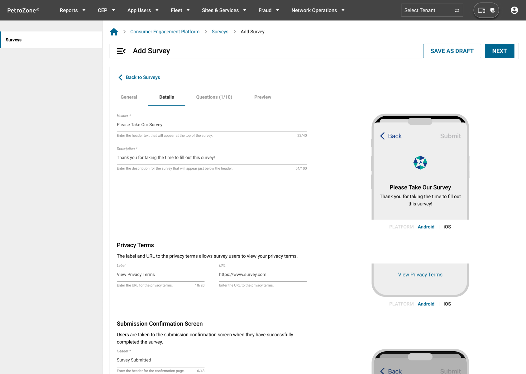 Clients were impressed with the new UI, which was a significant improvement over the previous UIs seen on the PetroZone web portal. They enjoyed the great amount of customization that they could add to their surveys, that tailored to their needs and desires. With instructions and supporting text as a part of the UI, clients were able to complete their surveys with little technical support.