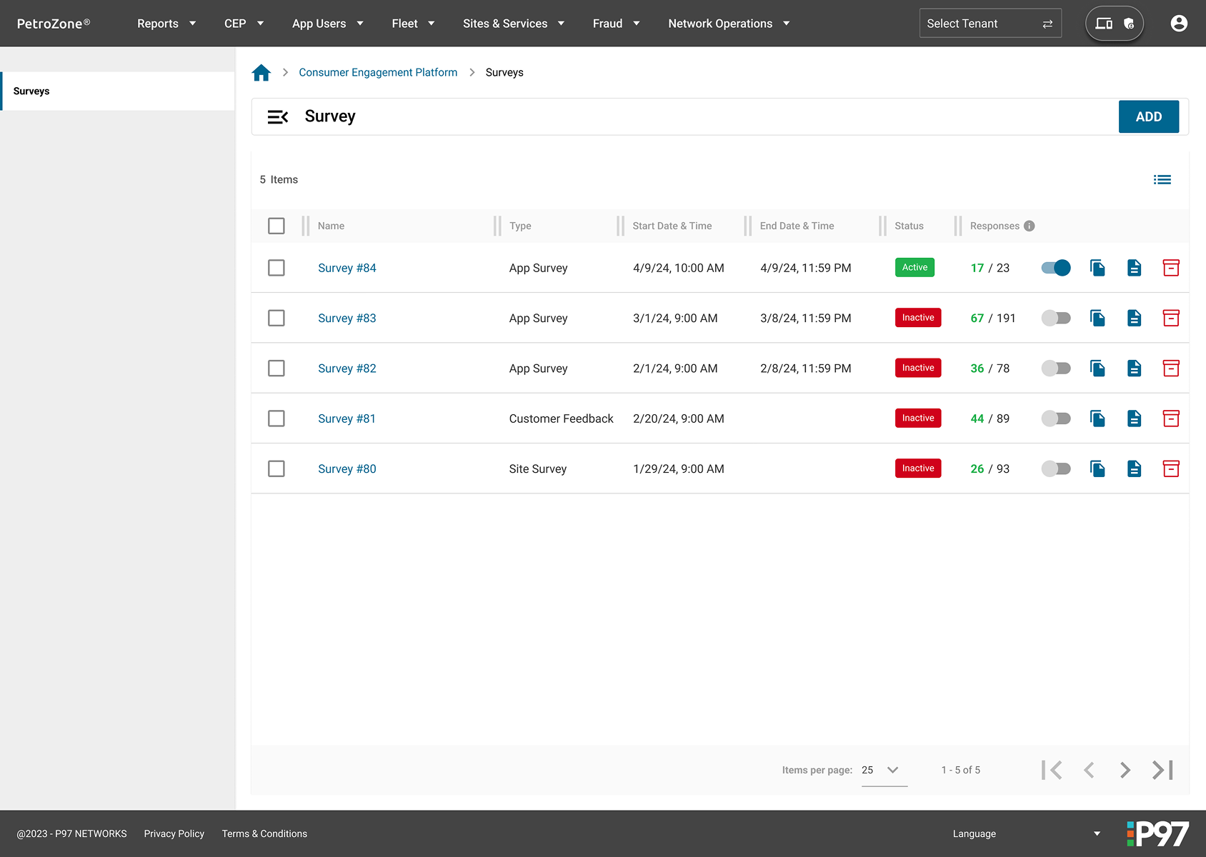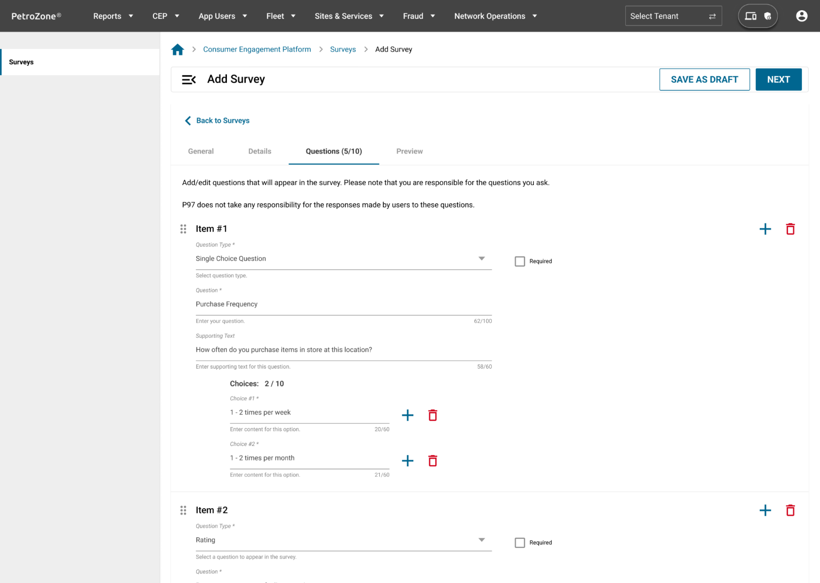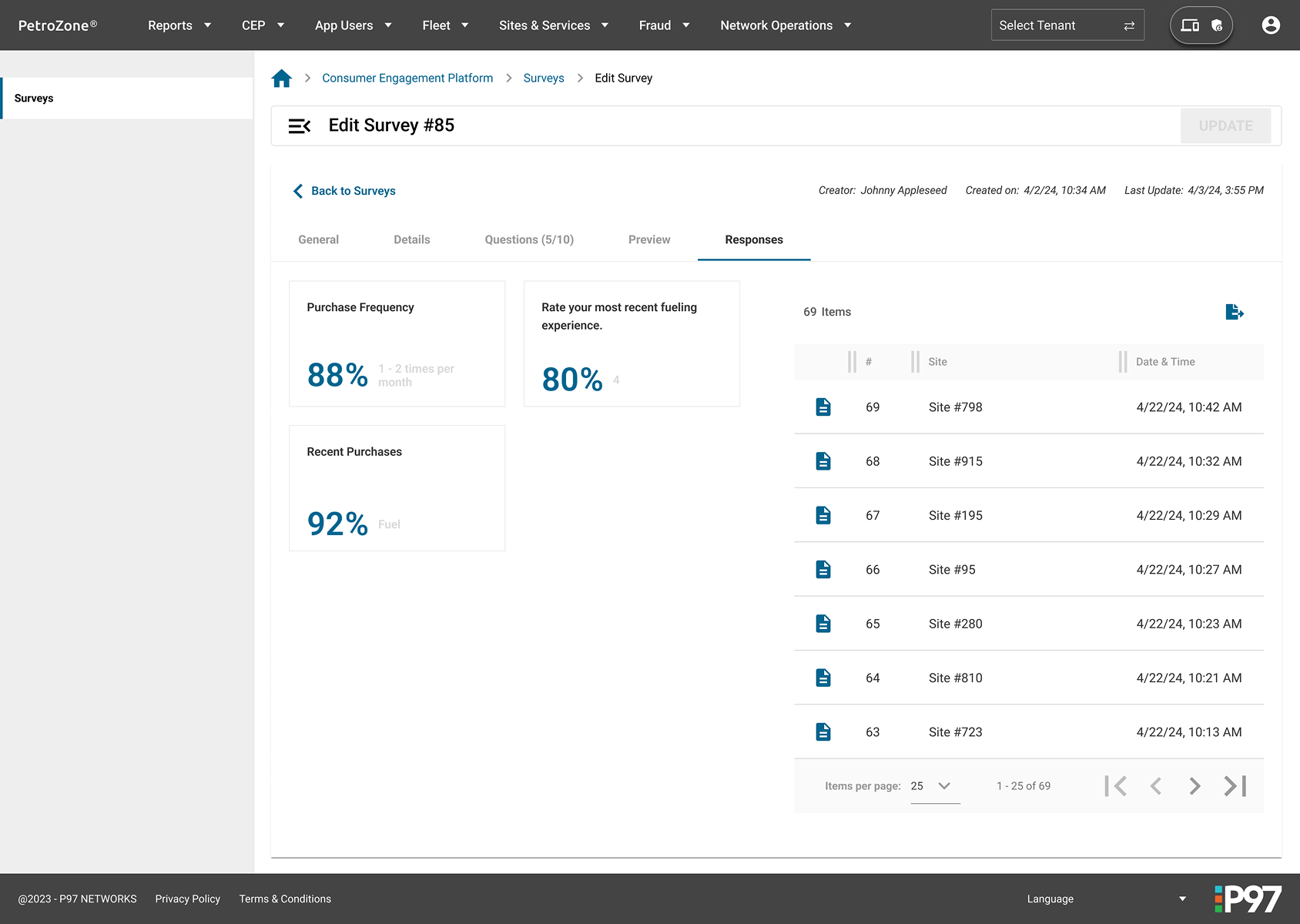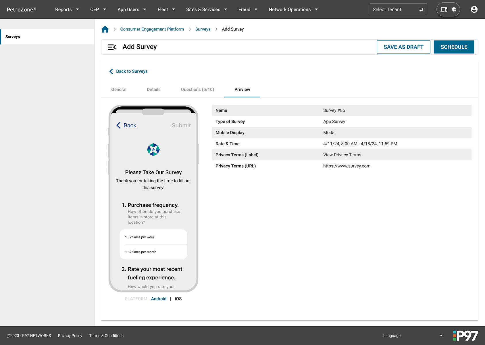 Clients of P97 Network looked to get feedback from their customers using their app to improve their services. As the Senior Product Designer for the PetroZone web portal, I worked with Project Managers and Developers to design a UI that would walk clients through the process of creating a customized survey to be displayed on their apps.