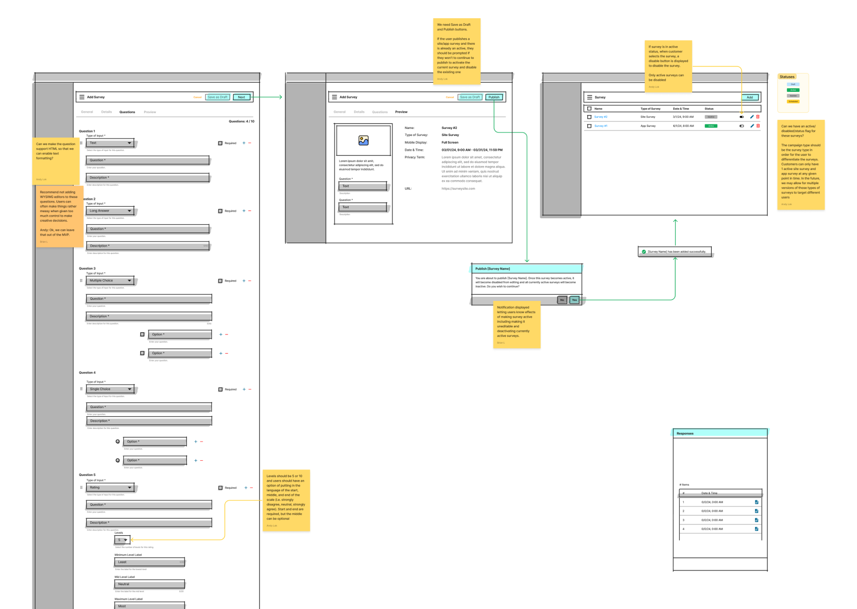 Created user flows to understand the journey of creating and modifying a survey, along with a wireframe to initially visualize the UI.